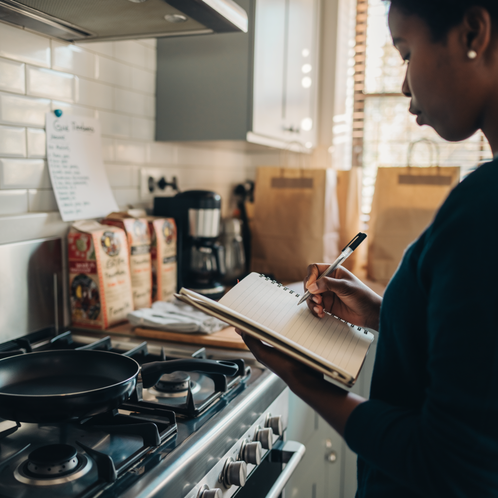 慌ただしい朝のキッチン。湯気の立つマグカップの横に、冷蔵庫には手書きの買い物リストがマグネットで留められている。